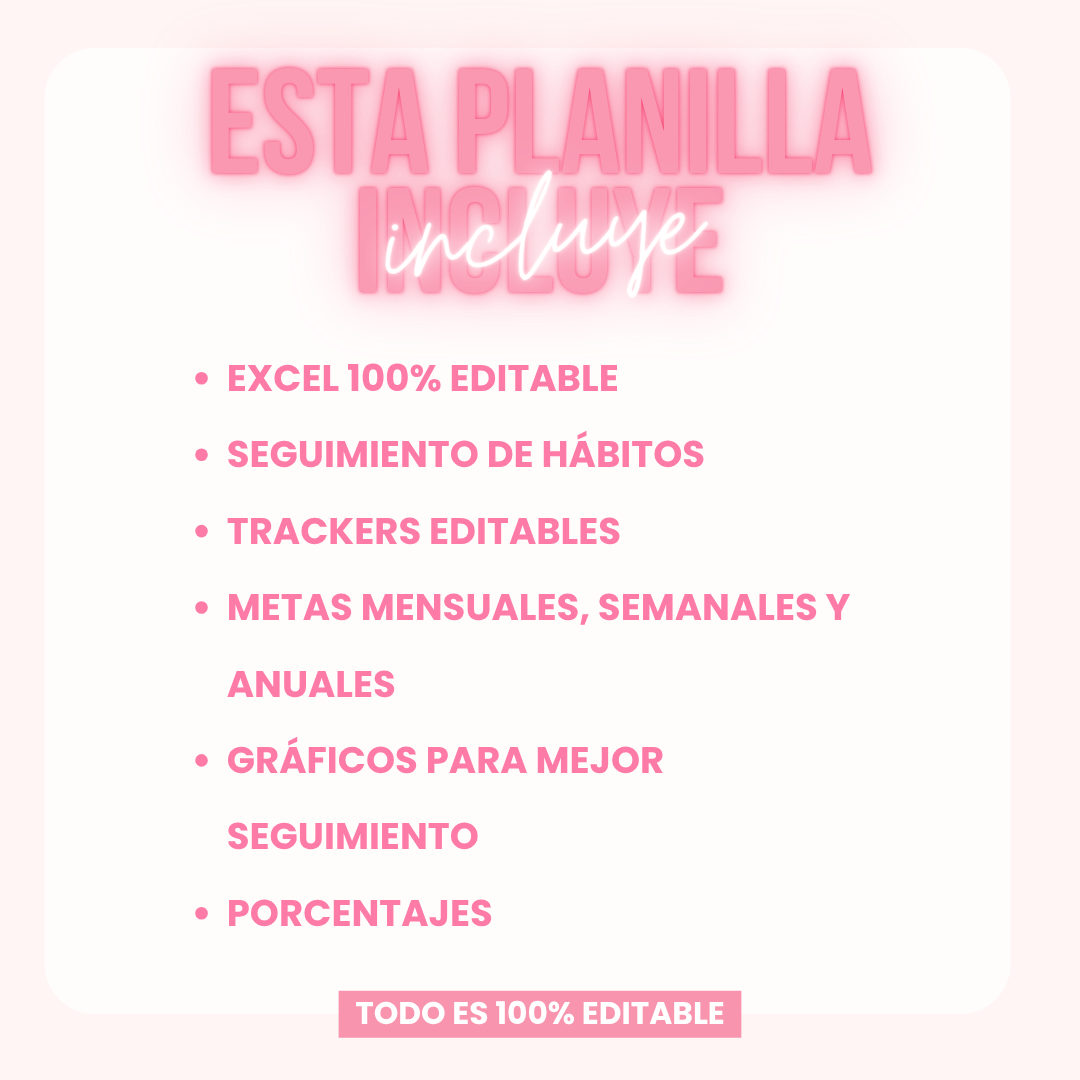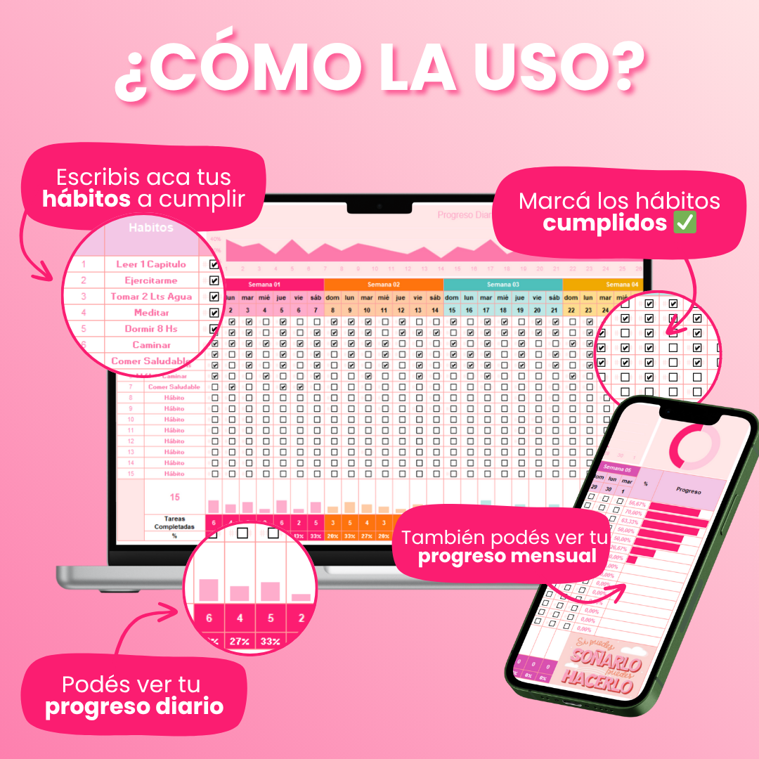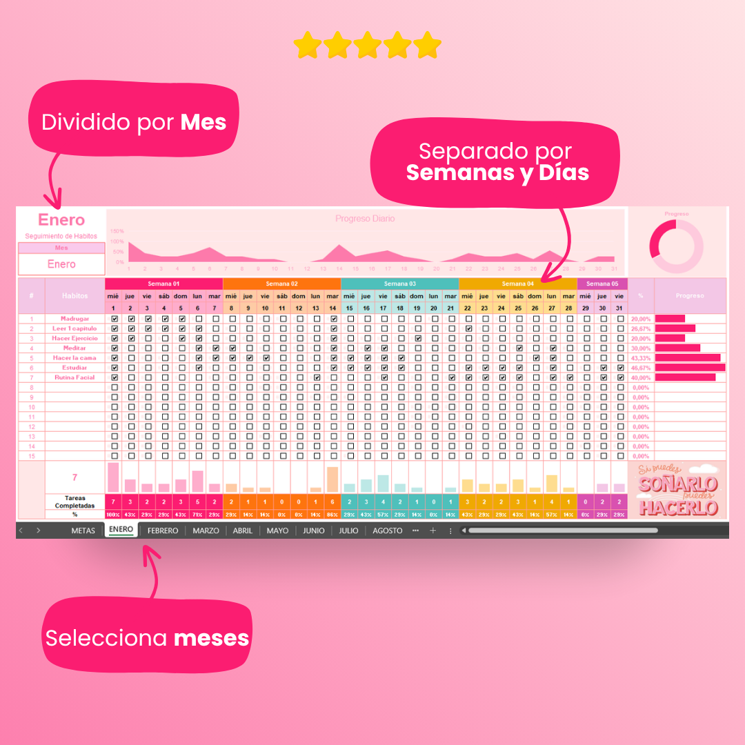 Organizá y mantené tus hábitos día a día con un diseño lindo, ordenado y fácil de usar. Incluye todos los meses del año y podés usarlo para siempre.
