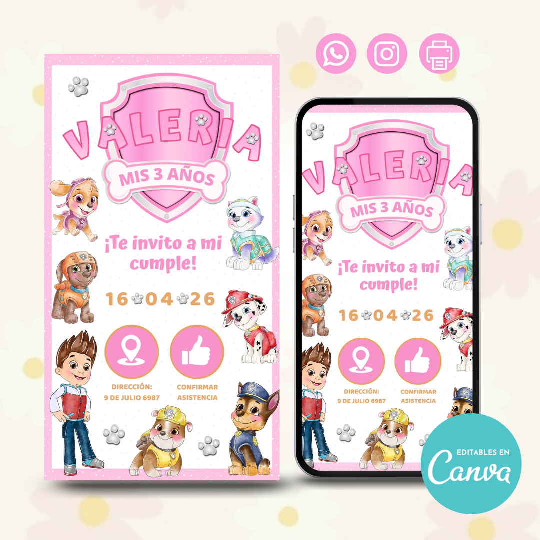 Esta invitación digital con temática de Patrulla Canina, en tonos rosados y estilo infantil, es ideal para cumpleaños de nenas y es 100% editable en Canva, sin necesidad de contar con Canva Pro.