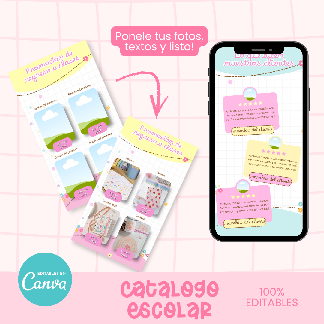 Mostrá tus productos de forma profesional y atractiva con este Catálogo Escolar 100% editable en Canva (versión gratuita) ✨