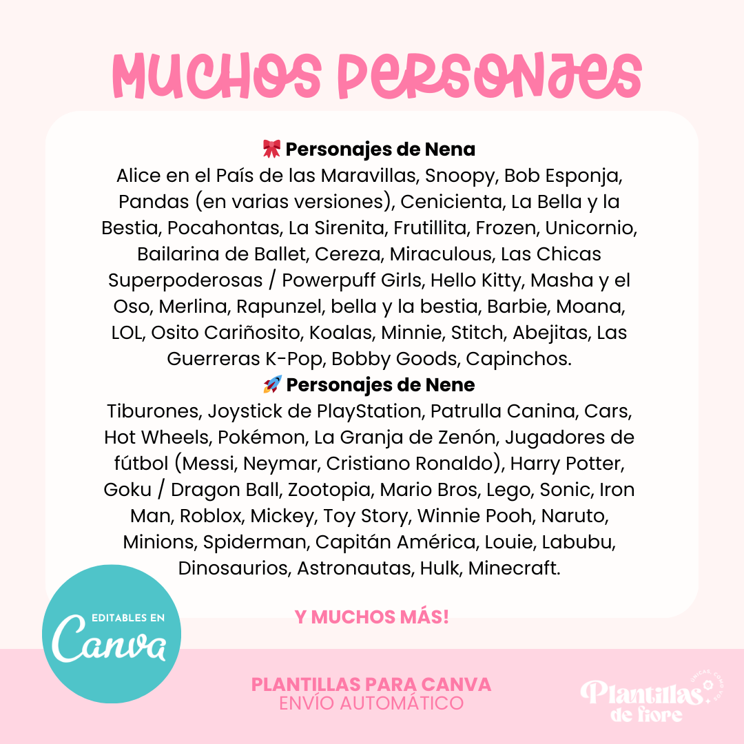 Alice en el País de las Maravillas, Snoopy, Bob Esponja, Andas (varias versiones), Cenicienta, La Bella y la Bestia, Pocahontas, La Sirenita, Futishita, Frozen, Unicornio, Bailarina de Ballet, Cereza, Miraculous, Las Chicas Superpoderosas / Powerpuff Girls, Hello Kitty, Masha y el Oso, Merlina, Rapunzel, La V, Barbie, Moana, LOL, Osito Cariñosito, Koalas, Minnie, Stitch, Abejitas, Las Guerreras K-Pop, Bobby Goods, Capinchos, Tiburones, Joystick de PlayStation, Patrulla Canina, Cars, Hot Wheels, Pokémon, La Granja de Zenón, Jugadores de fútbol (Messi, Neymar, Cristiano Ronaldo), Harry Potter, Goku / Dragon Ball, Zootopia, Mario Bros, Lego, Sonic, Iron Man, Roblox, Mickey, Toy Story, Winnie Pooh, Naruto, Minions, Spiderman, Capitán América, Louie, Labubu, Dinosaurios, Astronautas, Hulk, Minecraft.